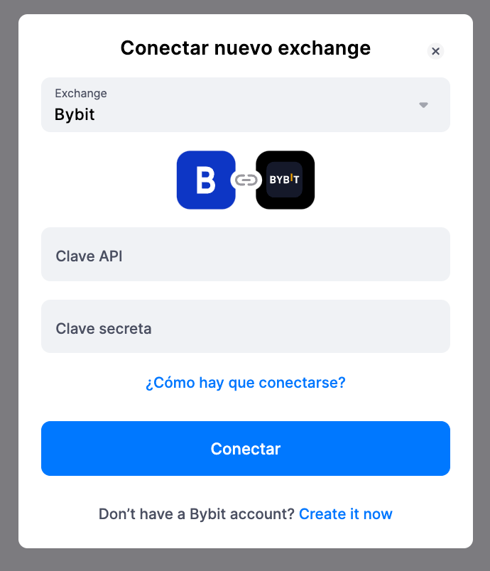 En la ventana emergente, debe seleccionar Bybit. Esto abrirá una ventana donde puede agregar su clave API y clave Secreta, luego haga clic en [Conectar].