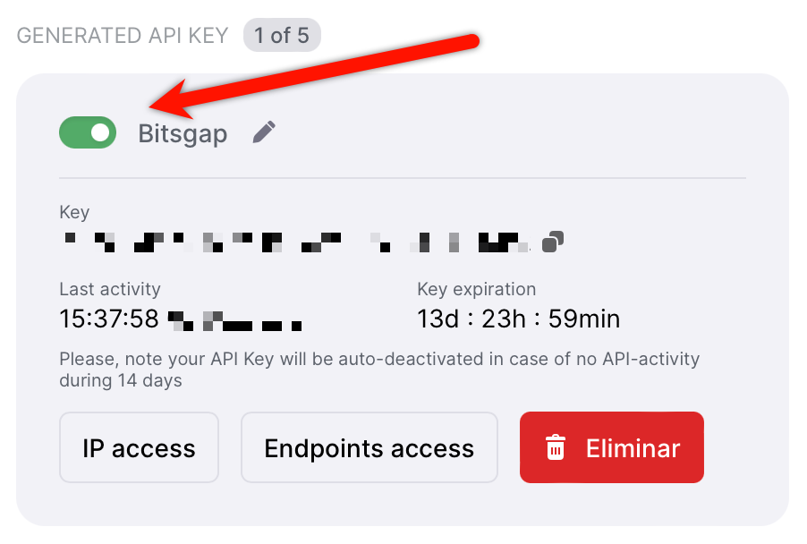 Una vez creada la clave API, asegúrese de hacer clic en el botón al lado del nombre de su clave API. De esta manera, ¡puede activar su clave API y agregarla a Bitsgap!