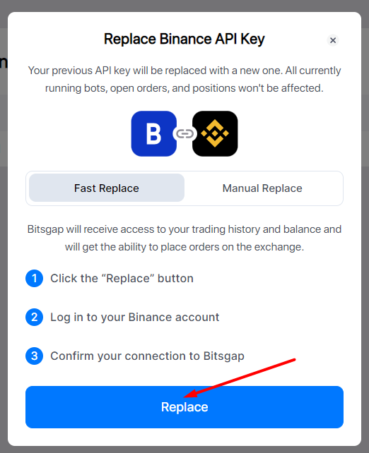 Fast Replace simplifica la actualización de las claves API y está disponible para los exchanges Binance, KuCoin y OKX. Siga estos pasos: