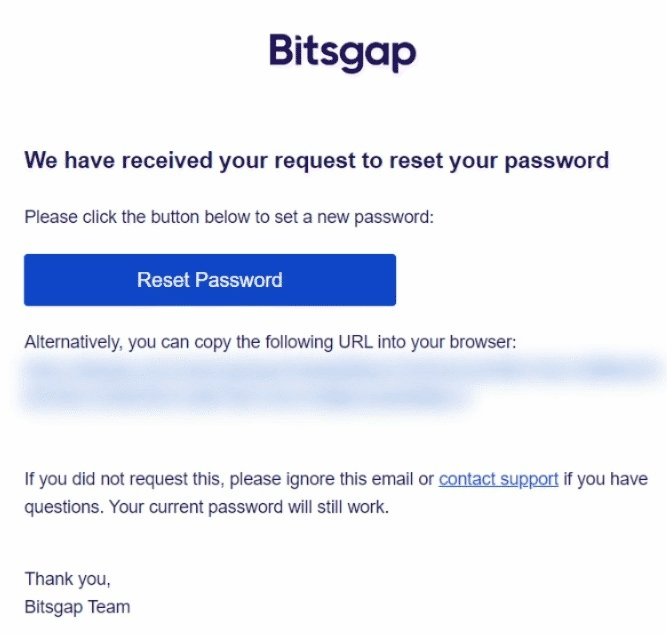 Si no has recibido ningún correo electrónico, por favor, comprueba la configuración de tu dominio del email. Es posible que tengan una política estricta en cuanto a los los correos electrónicos entrantes. Añade support@bitsgap.com y noreply@bitsgap.com a tu lista de contactos y solicita el restablecimiento de la contraseña de nuevo.