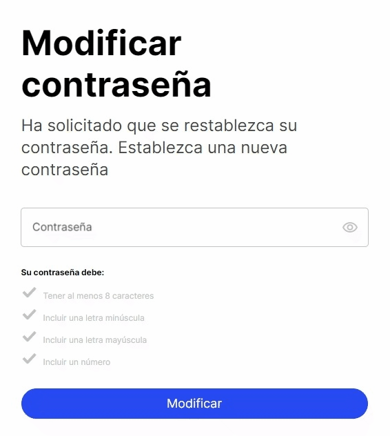 Ahora introduce una nueva contraseña. Por favor, asegúrate de que tu contraseña coincida con todos los siguientes criterios: