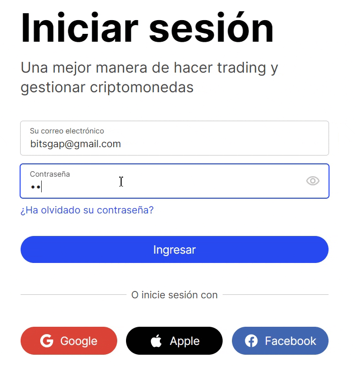 Después, serás redirigido a la página de inicio de sesión. Introduce tu email y la nueva contraseña. Una vez hecho esto, podrás acceder a tu cuenta de Bitsgap.
