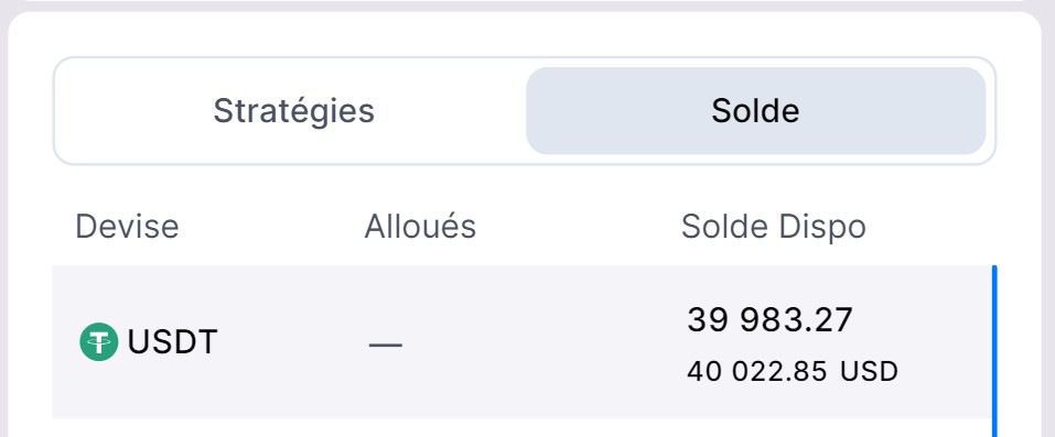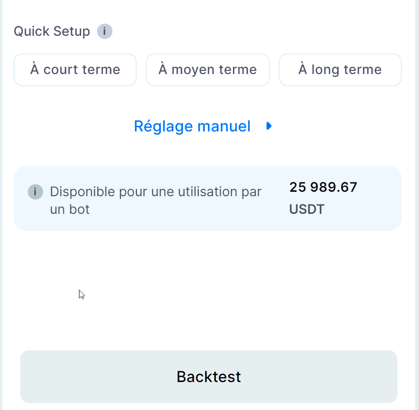 Lors de la création d’un bot DCA, l’investissement initial couvre à la fois les ordres d’averaging actifs et inactifs. Toutefois, seuls les fonds nécessaires aux ordres actifs sont réservés, laissant les fonds des ordres inactifs disponibles pour d’autres transactions jusqu’à leur activation.