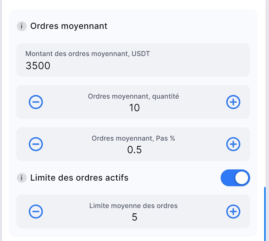 La limite d’ordres actifs permet de restreindre le nombre d’ordres d’averaging actifs en même temps. Au lieu de placer tous les ordres immédiatement, ils sont créés uniquement lorsque le prix atteint le niveau de DCA le plus proche de la position. Cette approche dynamique permet de garder des fonds disponibles pour d’autres transactions et de réduire le risque de surdimensionnement d’une position unique.