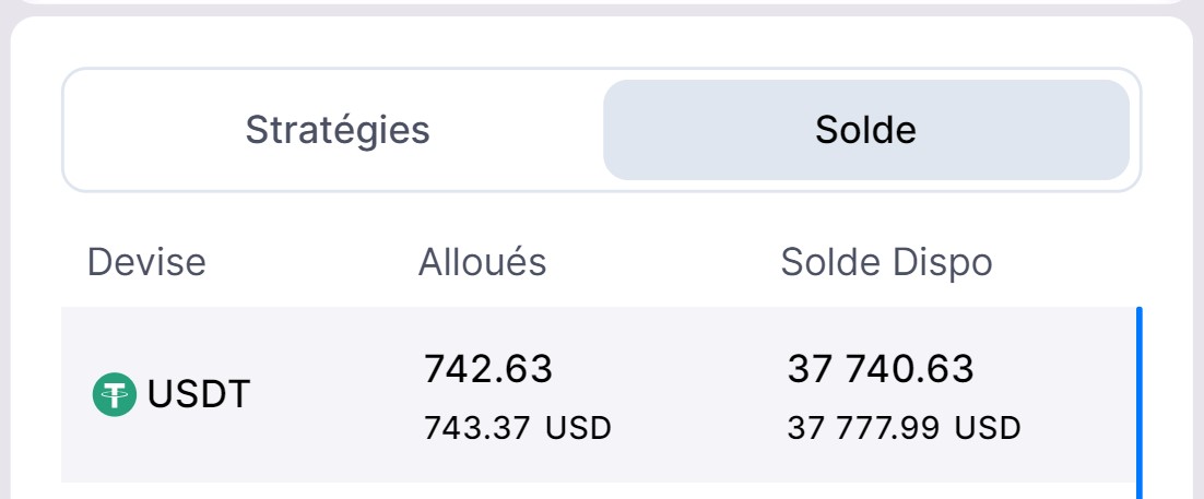 Ainsi, avec la limite d’ordres actifs activée, seuls ces 742,61 USDT sont réservés. Dès qu’un ordre actif est exécuté, un ordre inactif est placé pour le remplacer.