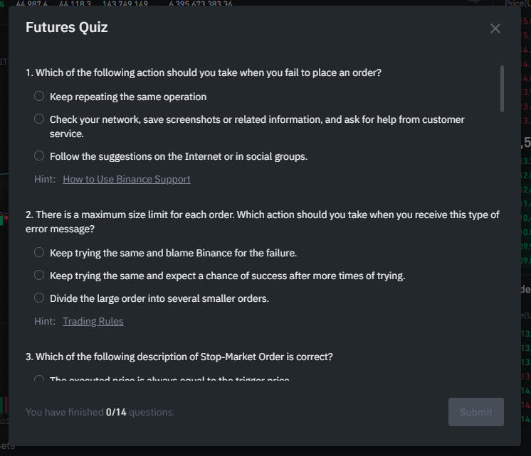 Dès que vous avez répondu aux questions, cliquez sur Soumettre. Si toutes les réponses sont correctes, l'interface de trading des Futures sera activée.