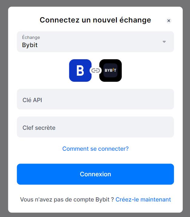 Dans la fenêtre pop-up, vous devez sélectionner Bybit. Cela ouvrira une fenêtre dans laquelle vous pourrez ajouter votre Clé API et votre Clé Secrète, puis cliquer sur [Connexion].