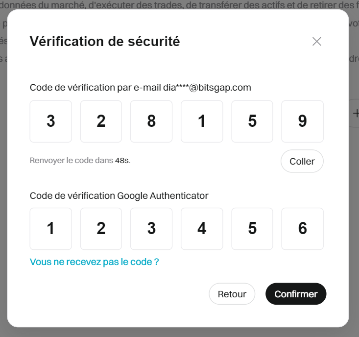 Saisissez votre code de vérification de l'e-mail et votre code 2FA, puis appuyez sur [Vérifier].