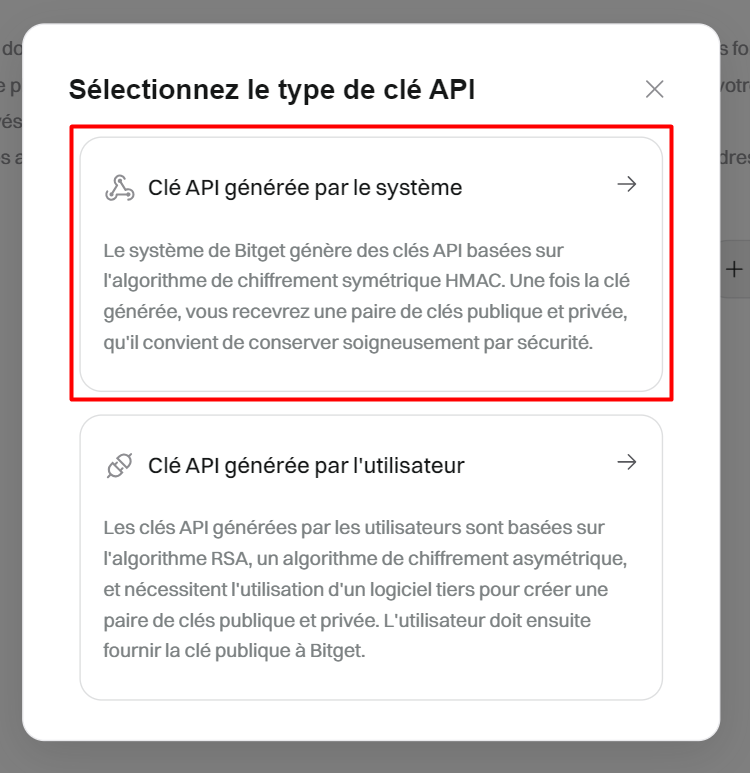 Sélectionnez «Clé API générée par le système» et procédez à la création de votre clé en cliquant sur la flèche.