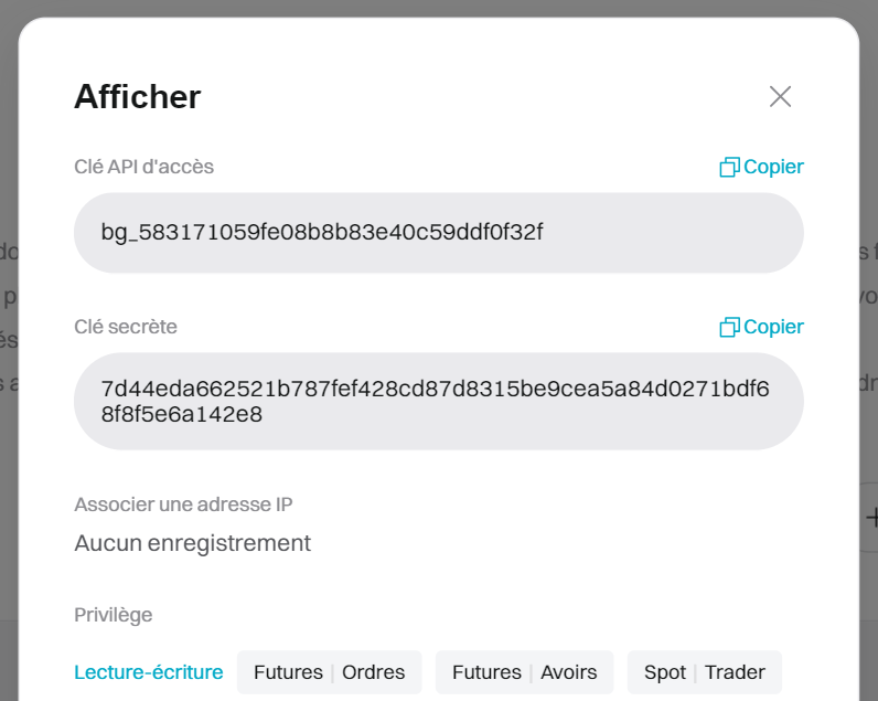 Votre clé de trading Bitget a été créée avec succès et est prête à être connectée à notre plateforme ! Veuillez copier votre clé API et votre clé secrète dans un endroit sûr avant de les ajouter à Bitsgap.