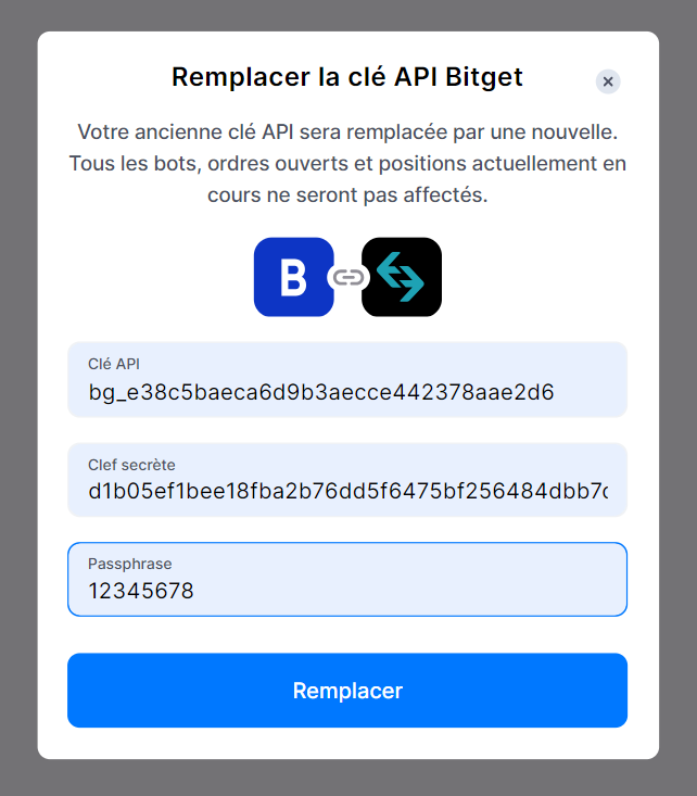 Insérez votre clé API, votre clé secrète et votre phrase de passe. Procédez au renouvellement de la clé API en cliquant sur le bouton [Remplacer] pour mettre à jour les paramètres de votre clé API.