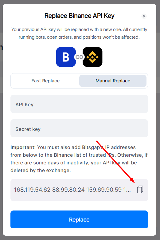 Pour les exchanges qui ne supportent pas Fast Replace, suivez ces étapes pour mettre à jour manuellement votre clé API.
