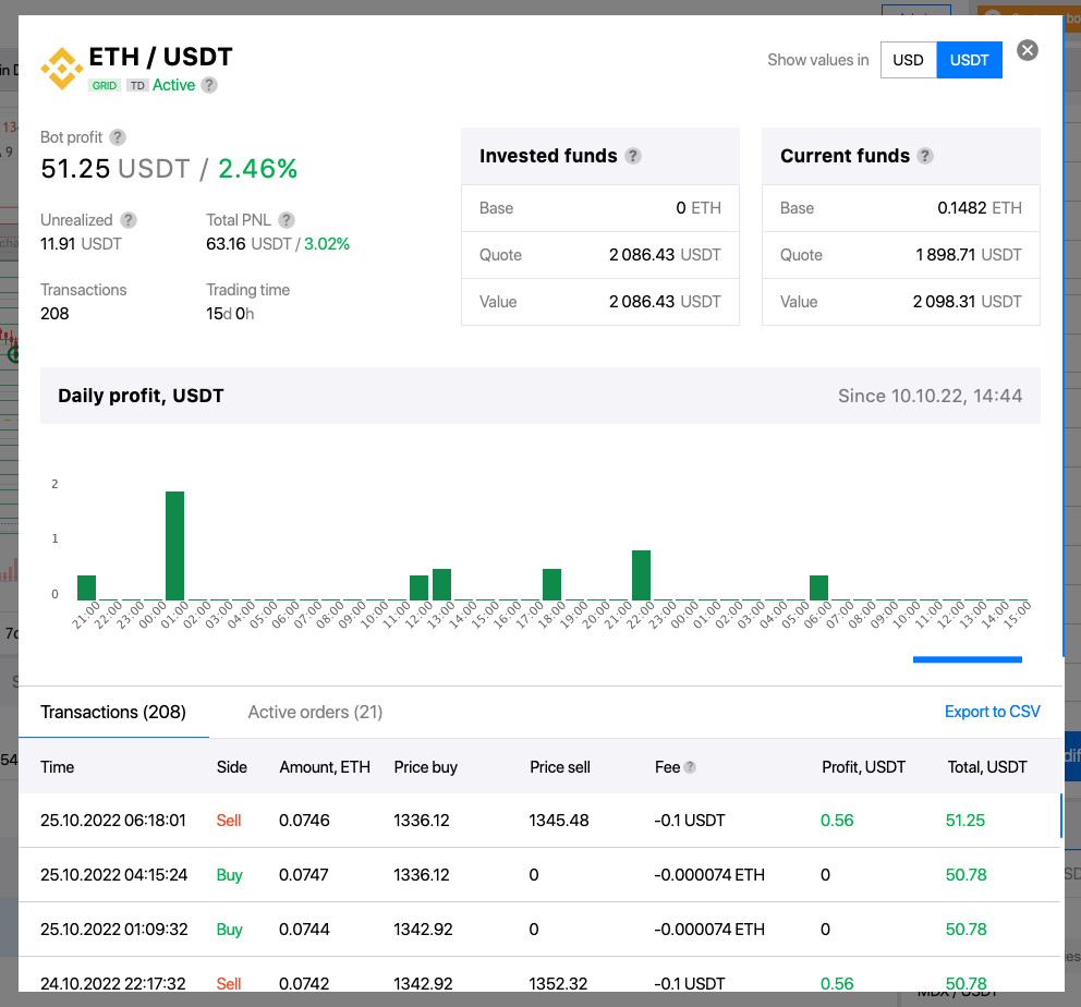 In the new View modal window, we put a lot of focus on the Bot profit, as it reflects the actual performance of your bot. In addition, we also consider how your funds' value changes in relation to the current market price and what change in your trading balance you can expect if you decide to stop the bot and sell the base currency.