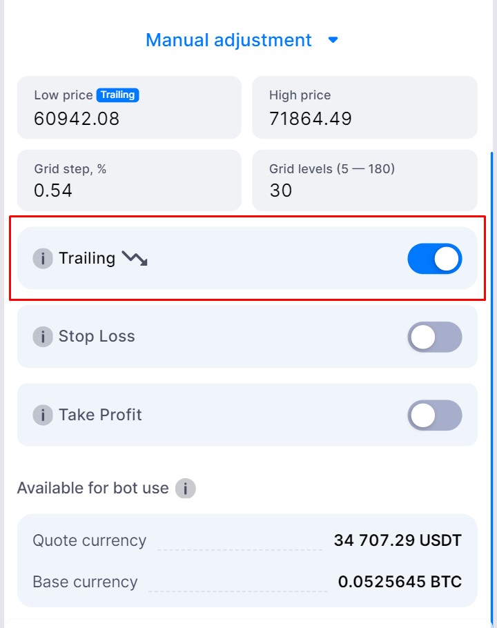 The Trailing Down feature helps your bot adapt when prices drop below the grid range. It cancels upper sell orders and places new buy orders at the grid's bottom without requiring additional funds or manual adjustments.