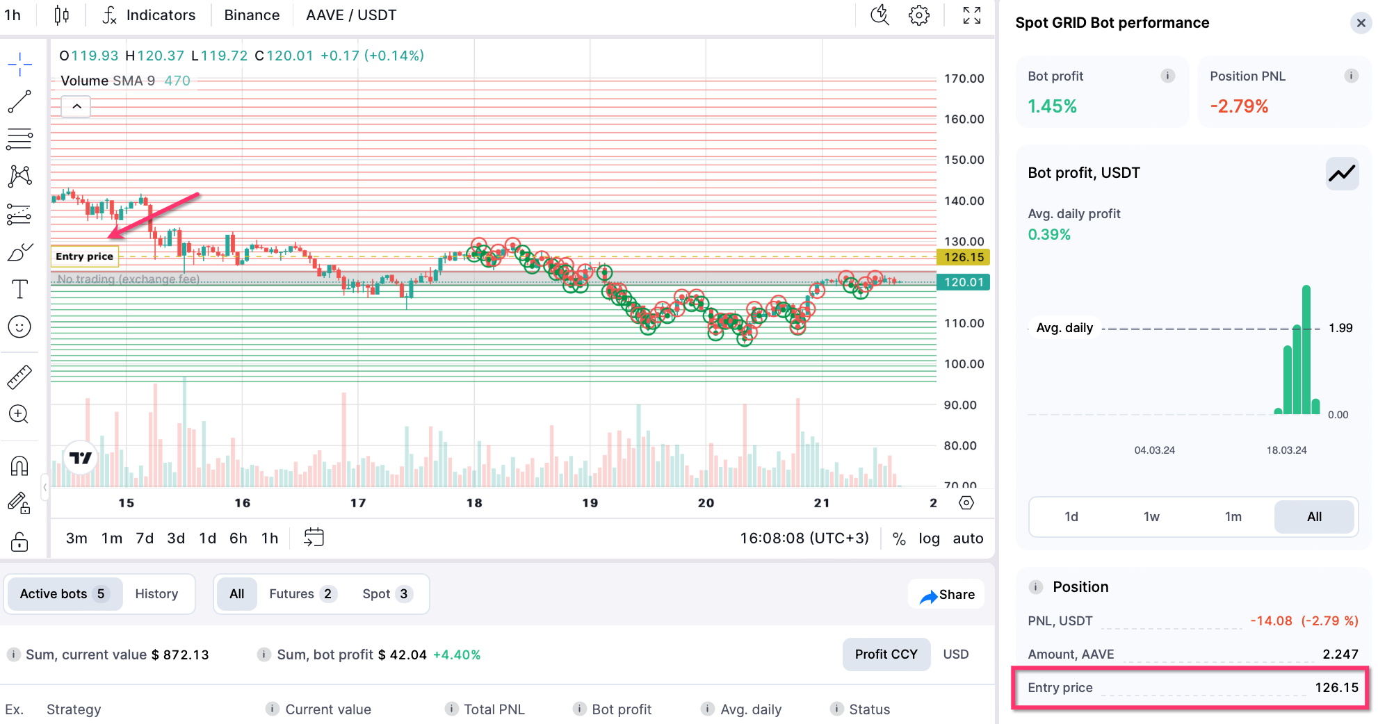 We have included the Entry Price in the bot's chart, which displays the average price of the current position, i.e., the traded currency that the bot is currently using. This feature enhances your understanding of your trading position, enabling you to make more informed decisions.