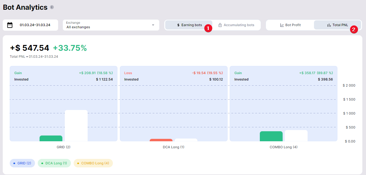 A new option on the Bots Analytics page allows users to gain deeper insights into the profitability of their bots over a specified period. When you select “Earning bots” and “Total PNL”, you will receive comprehensive information about the total profit generated by each type of bot. This addition aims to give you a clearer understanding of which bots perform well.