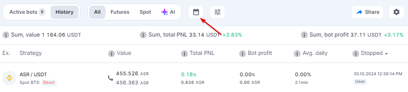 On the Bots page, under the “History” tab, the calendar icon has been moved next to the filter icon, making it faster and more convenient to access and apply date filters.