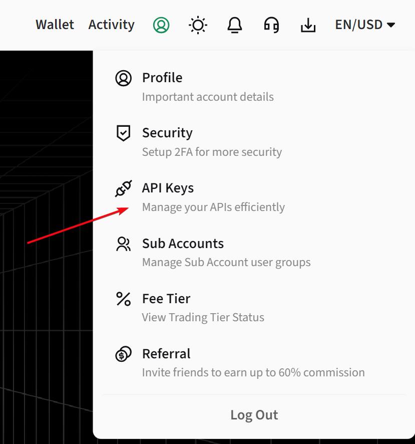 From the top bar in your Poloniex account, click on your profile icon and navigate to the API keys page.