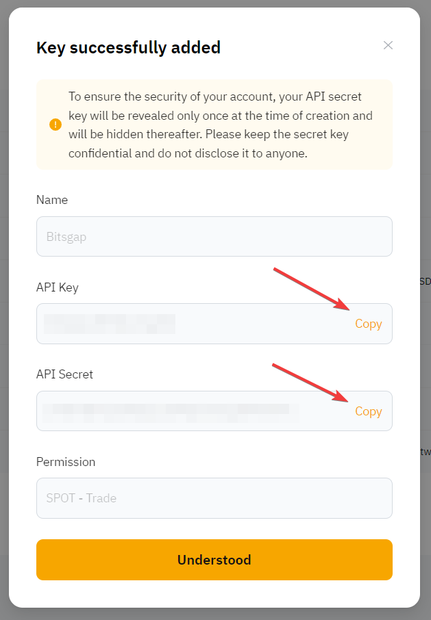 Once the API key is created, copy the API Key and Secret Key. Store them securely as you will need them to complete the connection with Bitsgap. You will not be able to see these keys again once you click Understood.