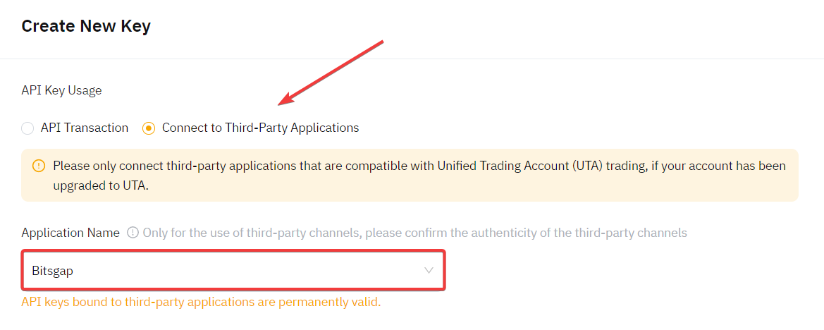 - Connect to Third-party Applications: Choose Bitsgap as the application name.