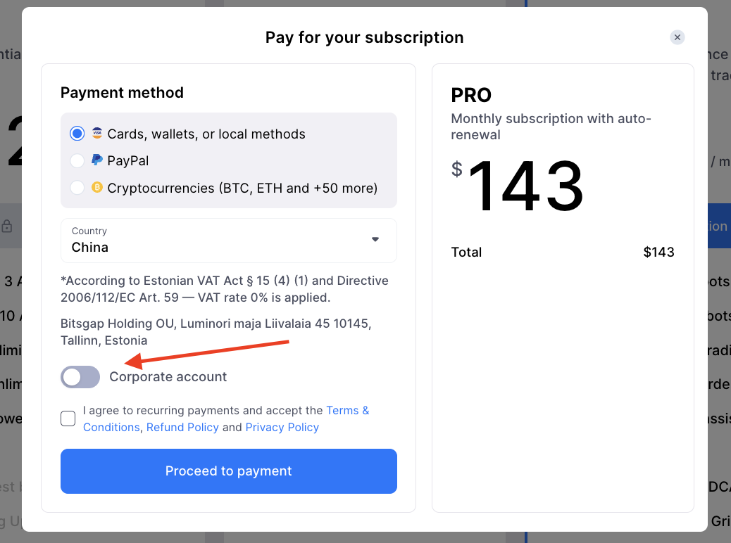 If you are a European company, Bitsgap allows you to make VAT-exempt payments for any subscription plans via your corporate account. Here's how you can purchase a plan using your business account.