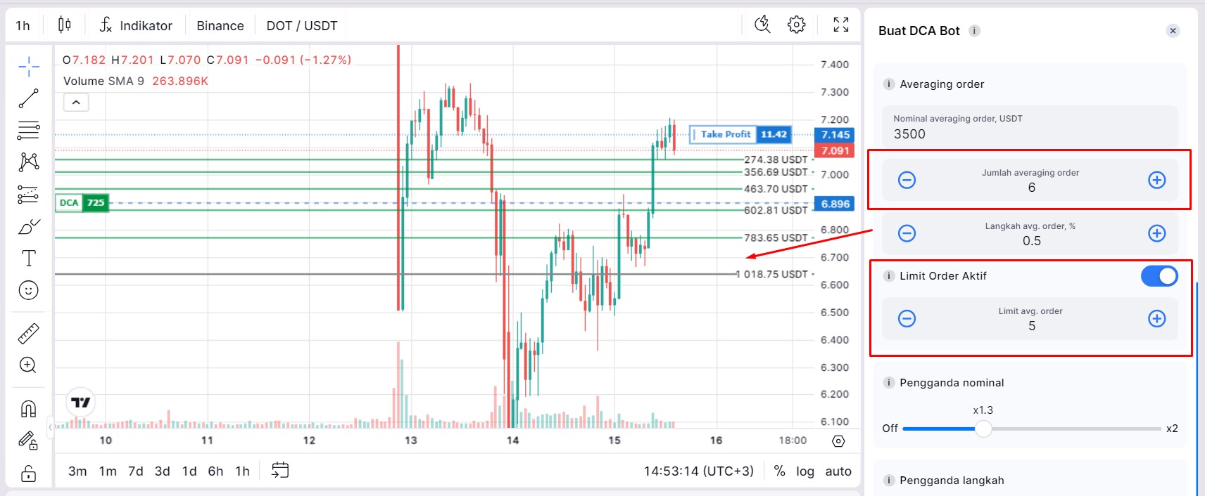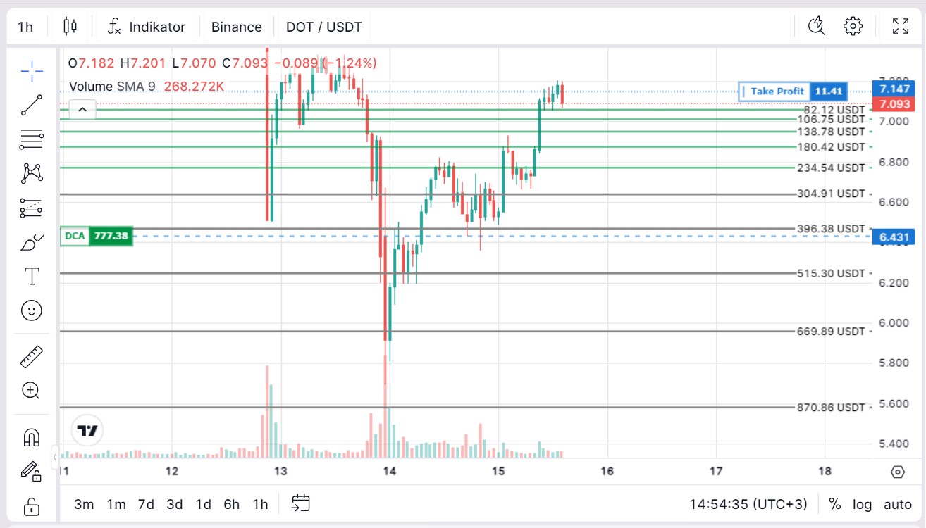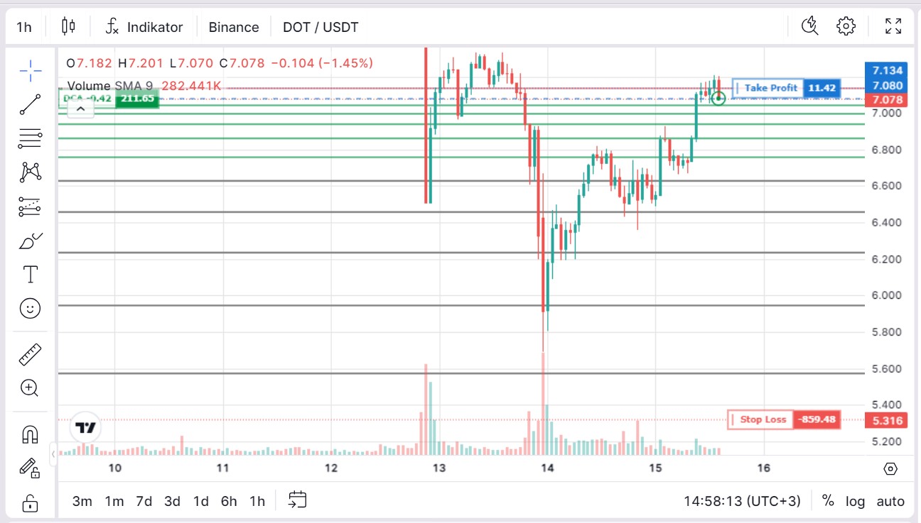 Misalnya Anda mengatur bot untuk pair DOT/USDT dengan parameter: