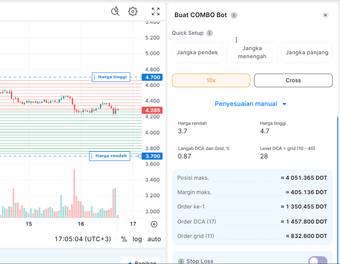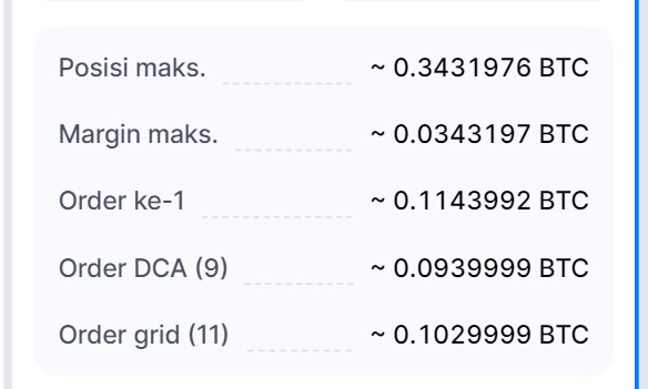 - DCA + Grid Levels: Menentukan jumlah level yang akan digunakan bot untuk menempatkan order.