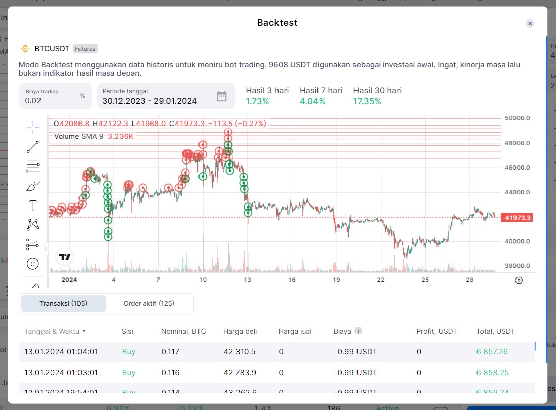 Gunakan fitur Backtest untuk melihat bagaimana performa bot Anda berdasarkan data historis.