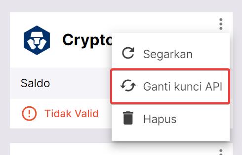 Buka halaman “Exchange Saya” dan cari kunci API Crypto.com Anda. Klik tiga titik di pojok kanan atas, kemudian pilih [Ganti kunci API].