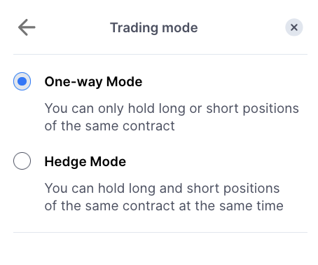 Pengaturan ini memungkinkan Anda dengan mudah beralih antara One-way Mode dan Hedge Mode untuk perdagangan futures, langsung dari platform.