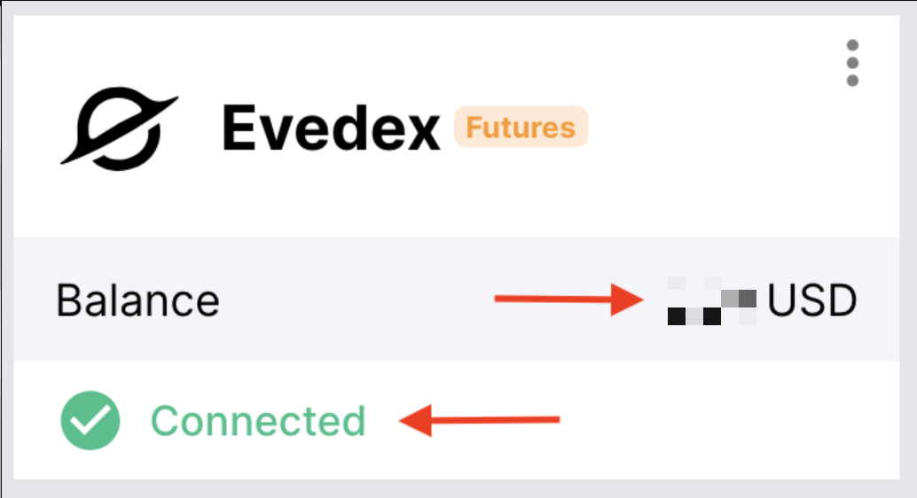 - Evedex akan muncul di My Exchanges dengan status Connected, dan saldo trading yang tersedia akan ditampilkan.