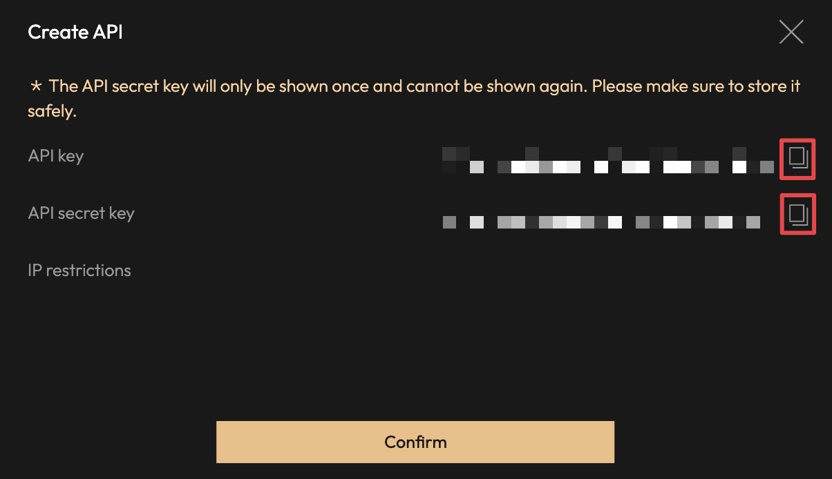 Isi kolom IP Restrictions dengan daftar IP dari akun Bitsgap Anda.