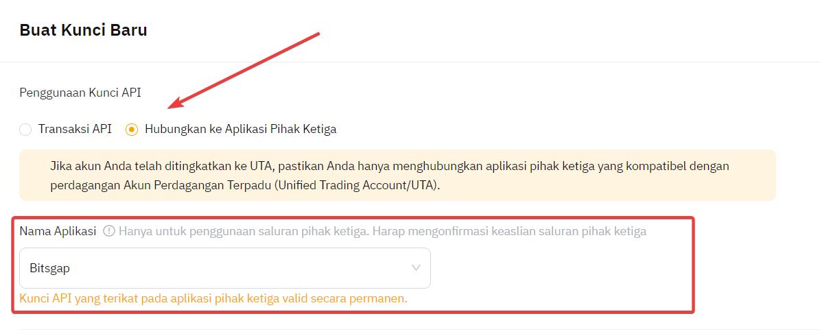 Pertama, pilih opsi Hubungkan ke Aplikasi Pihak Ketiga dan pilih Bitsgap secagai nama aplikasinya.