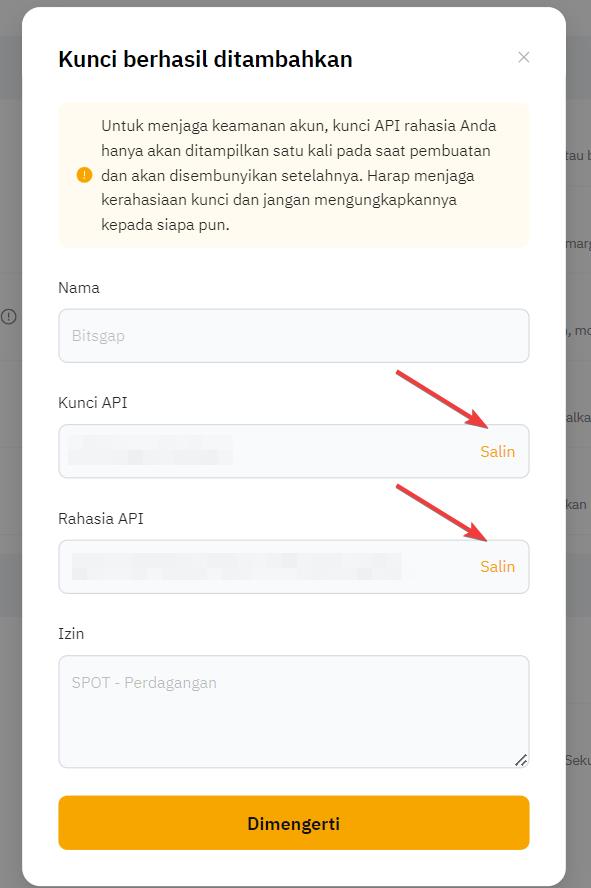 Kunci trading Bybit Anda berhasil dibuat dan siap dihubungkan dengan platform kami! Pastikan untuk menyalin kunci API dan kunci Rahasia di tempat yang aman sebelum ditambahkan ke Bitsgap. Setelah mengklik Mengerti (understood), Anda tidak akan melihat kunci API tersebut lagi.