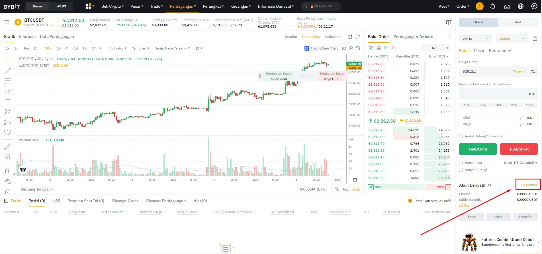Agar dapat trading di exchange ini melalui Bitsgap, penting untuk melakukan upgrade ke UTA. Caranya, buka halaman Trade atau Derivatif Bybit dan klik opsi Upgrade.