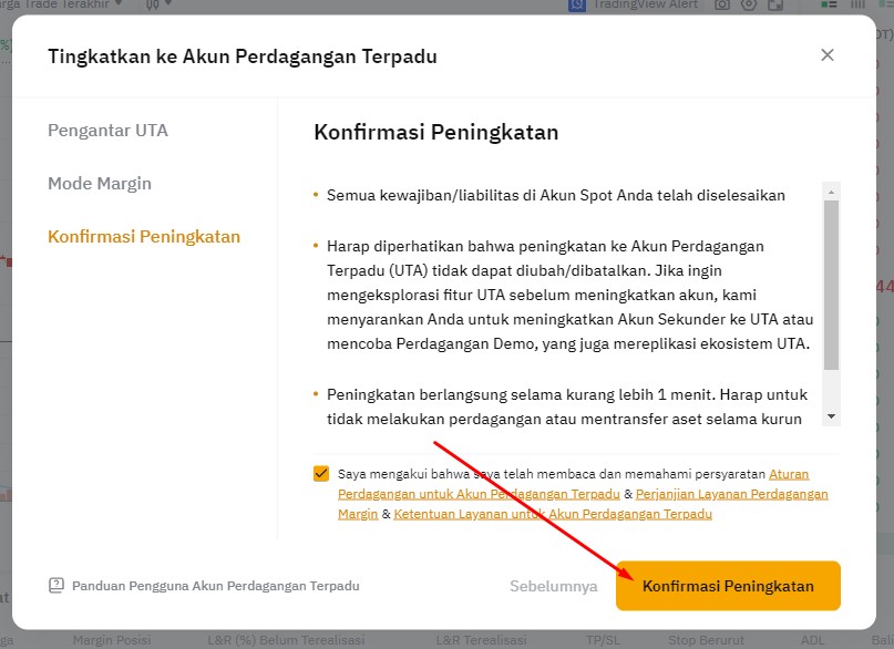 Bacalah pengantar dan detailnya di jendela pop-up untuk lebih memahami Perdagangan Terpadu. Setelah itu, klik [Konfirmasi Peningkatan] untuk menyelesaikan transisi ke UTA.