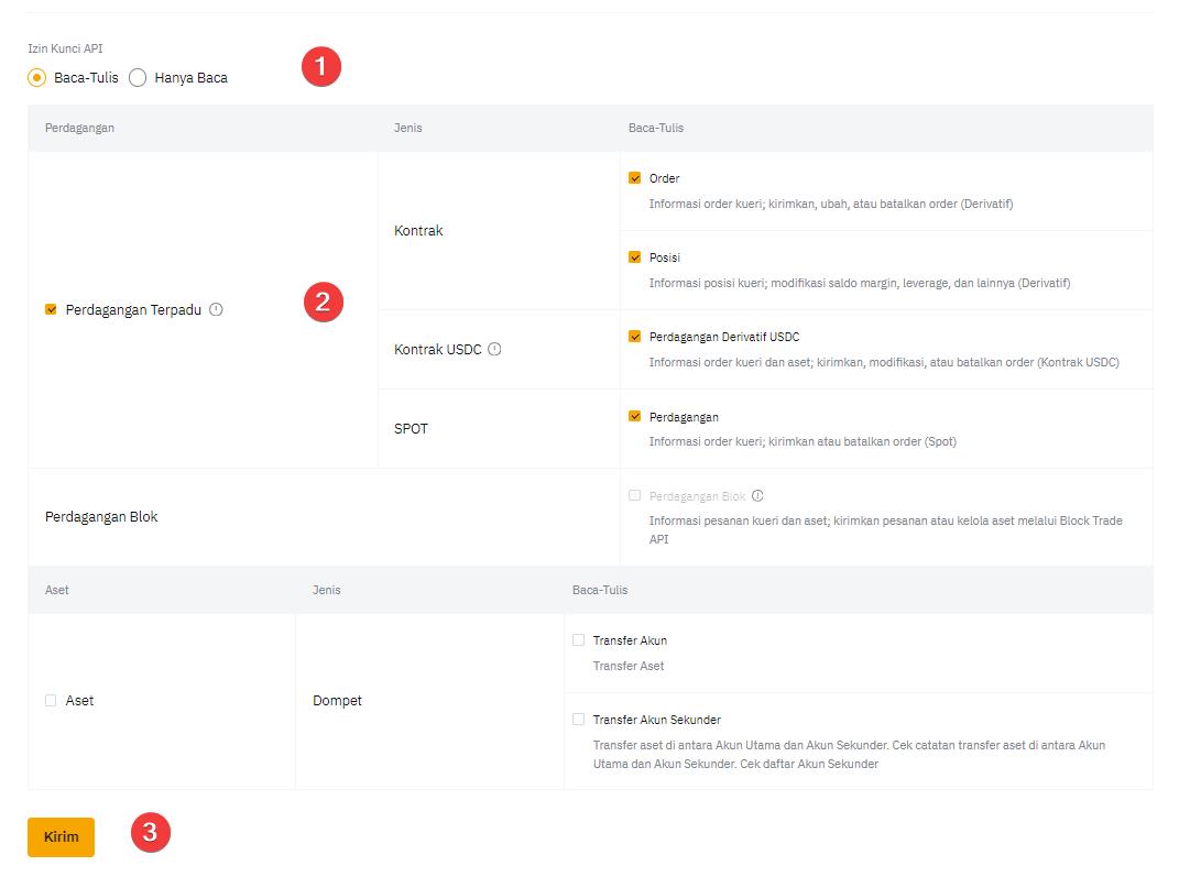 Edit izin Anda seperti pada contoh di bawah ini. Langkah ini akan memungkinkan kami untuk membaca riwayat Anda, saldo terkini, dan mengeksekusi transaksi di akun exchange Anda.