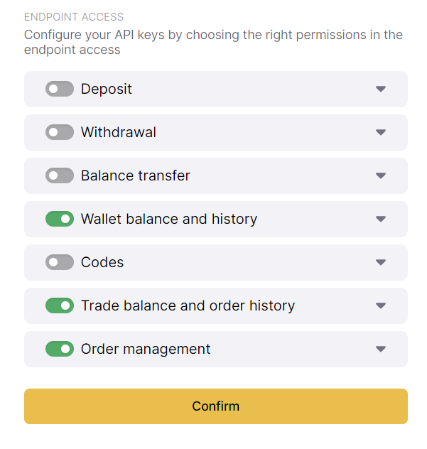 Selanjutnya, edit izin Anda dalam akses endpoint seperti contoh di bawah ini. Pembatasan ini akan memungkinkan kami untuk membaca riwayat dan saldo Anda saat ini, serta menjalankan trading di akun exchange Anda.
