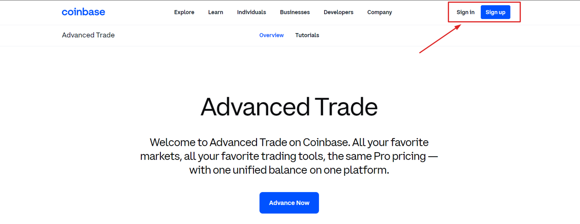 Masuk ke akun Coinbase Advanced Trade Anda atau buat akun baru.