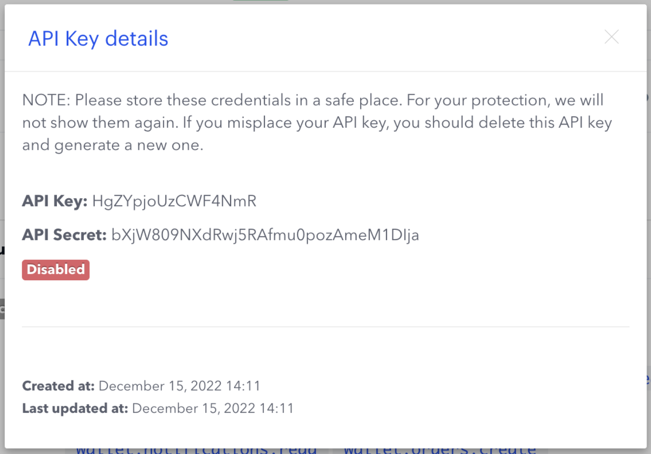 Setelah membuat kunci API Coinbase Advanced Trade baru, jendela dengan kunci Publik dan Rahasia akan muncul. Salin dan simpan di tempat yang aman (misalnya, pengelola kata sandi).