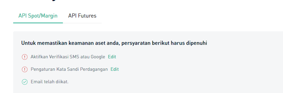 Semua operasi trading diproses melalui kunci API yang unik untuk masing-masing pengguna. Kunci API merupakan metode yang aman dan dapat diandalkan untuk menggunakan platform ini karena tidak memberikan akses ke data pribadi Anda dan mencegah pengelolaan dana (penarikan & deposit).