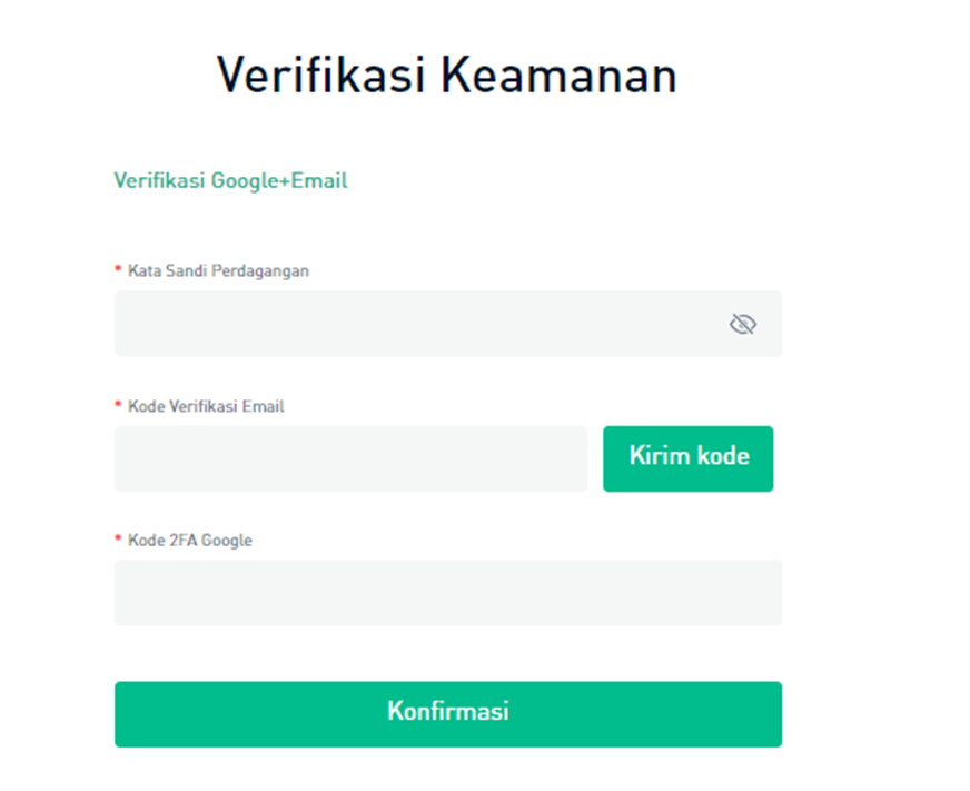Lengkapi kata sandi Perdagangan, kode verifikasi Email, dan kode 2FA, lalu klik tombol [Konfirmasi].