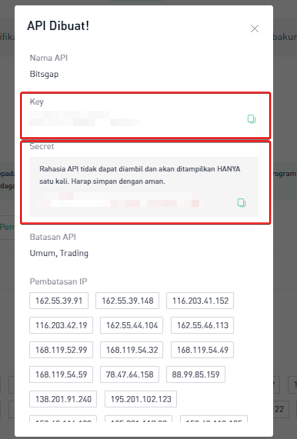 Kunci perdagangan Kucoin Anda berhasil dibuat dan siap dihubungkan ke platform kami! Salin kunci API dan kunci Rahasia Anda di tempat yang aman sebelum Anda menambahkannya ke Bitsgap.