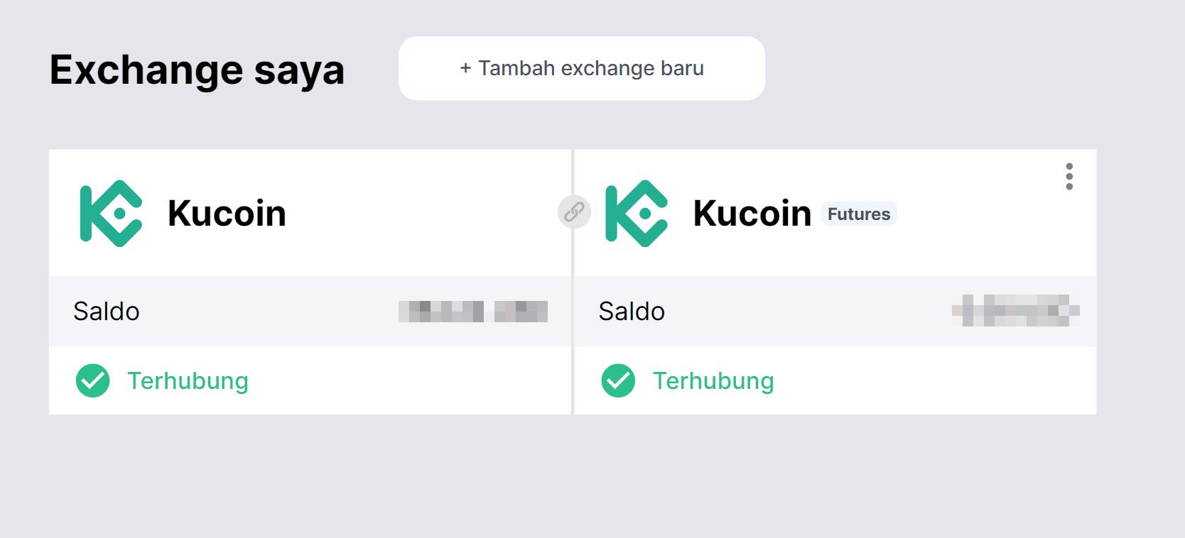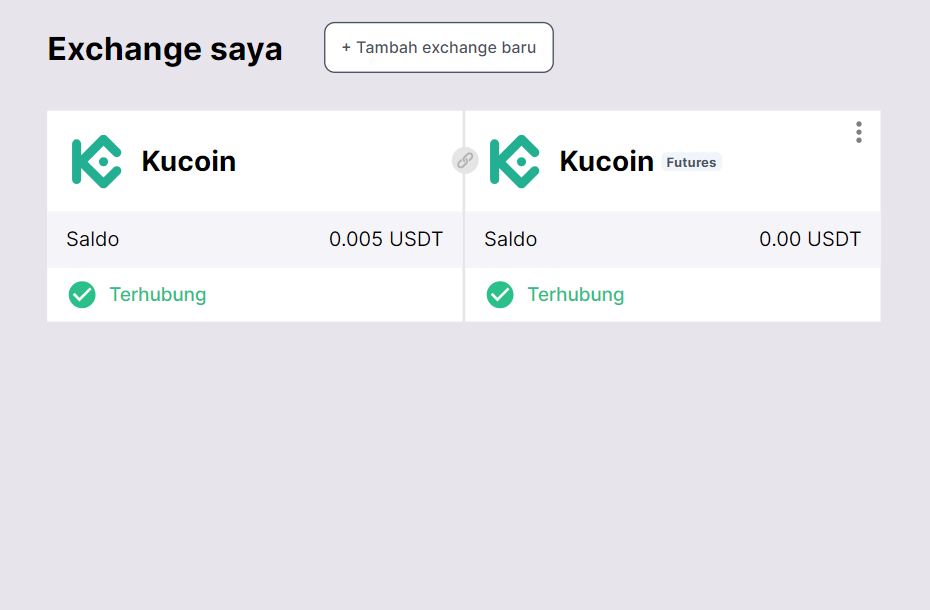 Jika semua langkah dilakukan dengan benar, Anda akan melihat KuCoin ditambahkan ke daftar exchange dengan status "Terhubung" dan saldo trading yang tersedia di akun Anda.