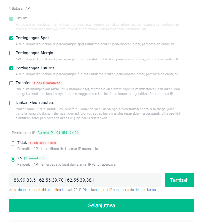 - Pembatasan IP: Ya (masukkan IP yang disalin dari tab Exchange Saya).