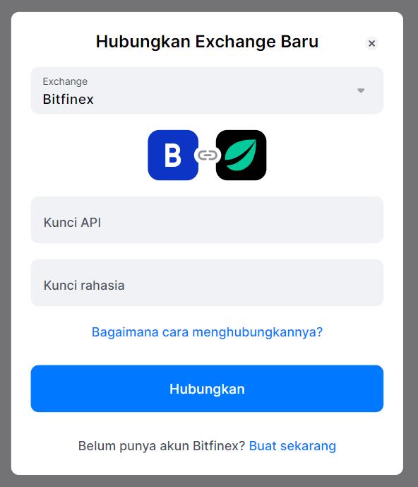 Dari jendela pop-up, pilih Bitfinex. Jendela di mana Anda harus menambahkan kunci API dan kunci Rahasia akan terbuka, kemudian klik [Hubungkan].