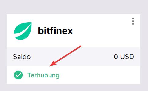 Bila semuanya sudah benar, Anda akan melihat Bitfinex ditambahkan ke daftar exchange terhubung Anda dengan status Terhubung dan saldo perdagangan tersedia di akun Anda.
