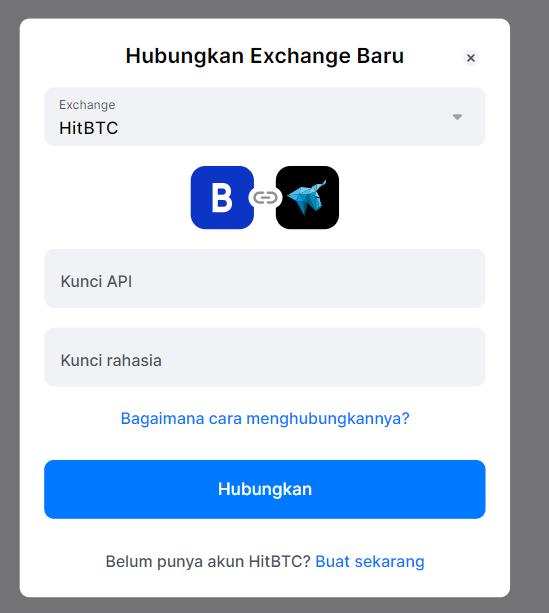 Dari jendela pop-up, pilih HitBTC. Langkah ini akan membuka jendela di mana Anda bisa menambahkan API key dan Secret key, kemudian klik [Hubungkan].