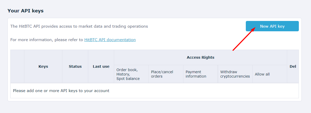 Kunci perdagangan HitBTC Anda berhasil dibuat dan siap dihubungkan ke platform kami! Pastikan untuk menyalin API key dan Secret key di tempat yang aman sebelum menambahkannya ke Bitsgap.