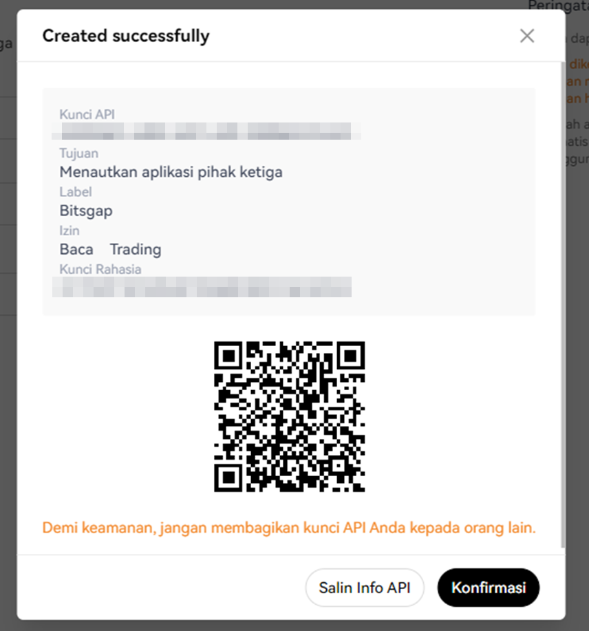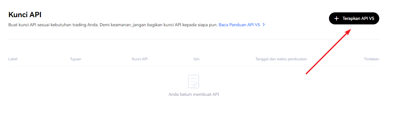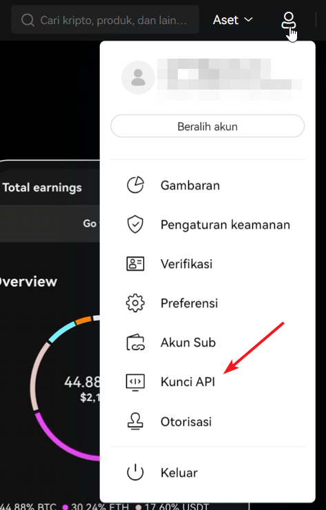 Semua operasi trading diproses melalui kunci API yang unik untuk masing-masing pengguna. Kunci API merupakan metode yang aman dan dapat diandalkan untuk menggunakan platform ini karena tidak memberikan akses ke data pribadi Anda dan mencegah pengelolaan dana (penarikan & deposit).
